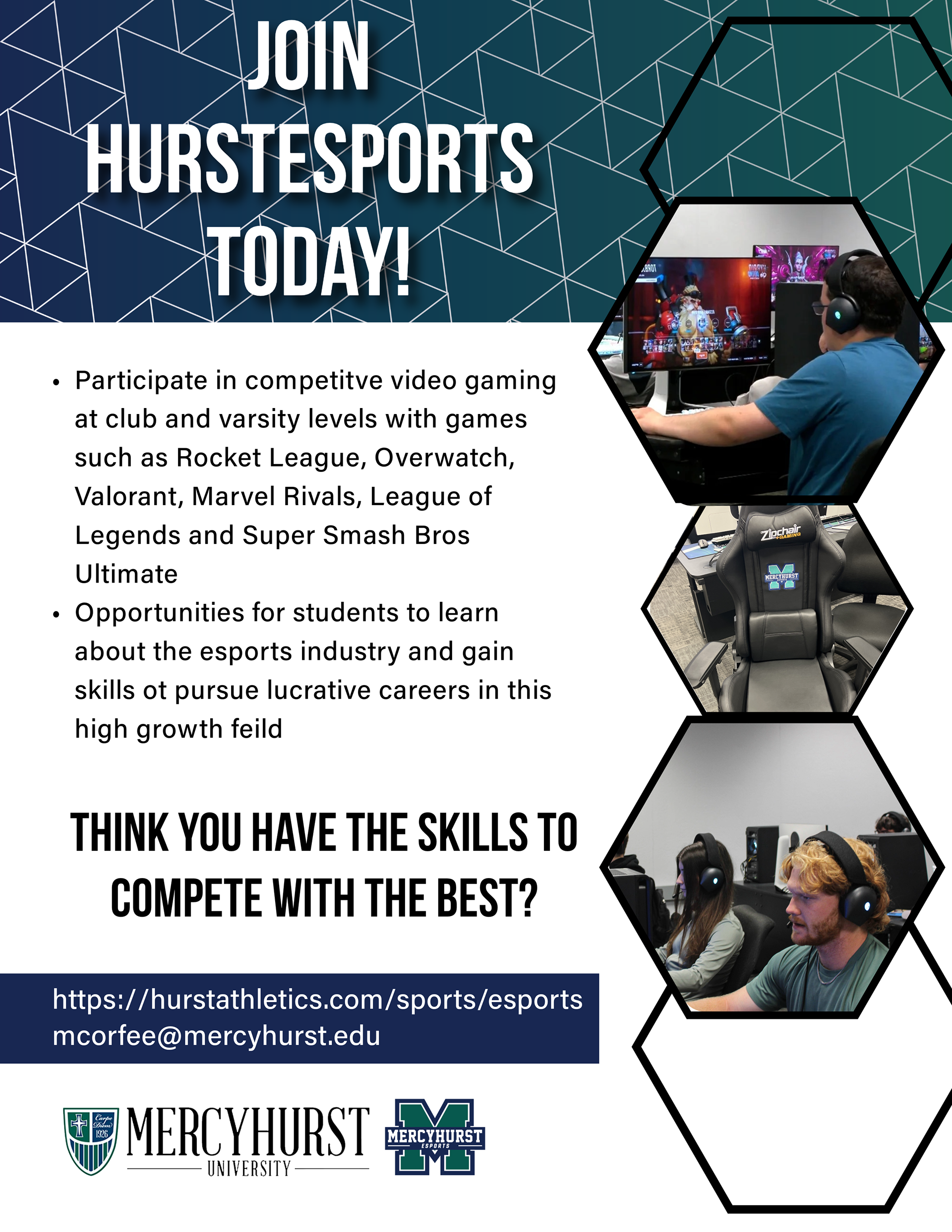 Flyer for Mercyhurst University Students to join the esports program on campus